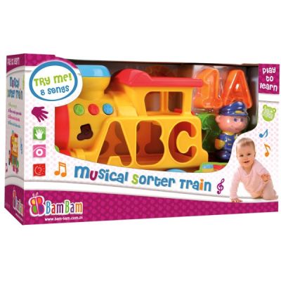BAM BAM Muzyczna lokomotywa, bezpieczna dla dzieci, żywa kolorystyka, wydaje dźwięki, od 18 miesiąca życia. Edukacyjna MUZYCZNA LOKOMOTYWA, jest jednocześnie sorterem kloców. Stymuluje rozwój słuchu, jak i rozwój zmysłu dotyku. Pojazd po naciśnięciu guzików wygrywa 8 melodii oraz wydaje dźwięki charakterystyczne dla pociągu. Dzięki kółkom dziecko może raczkować z zabawką i prowadzić ją. Do zestawu dołączone jest 6 klocków 3 cyferki i 3 literki, oraz postać motorniczego, którą można ustawić na lokomotywie.
